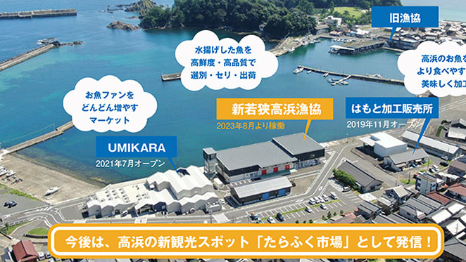今夏、この新漁協・UMIKARA・はもと加工販売所が集まった海沿いのエリアが、高浜の新観光スポット「若狭高浜たらふく市場」としてスタートします。美味しい、楽しい、欲しい、そして海や山の自然、漁師町ならではの優しさが“たらふく”感じられる、海辺のエンタメ市場です。